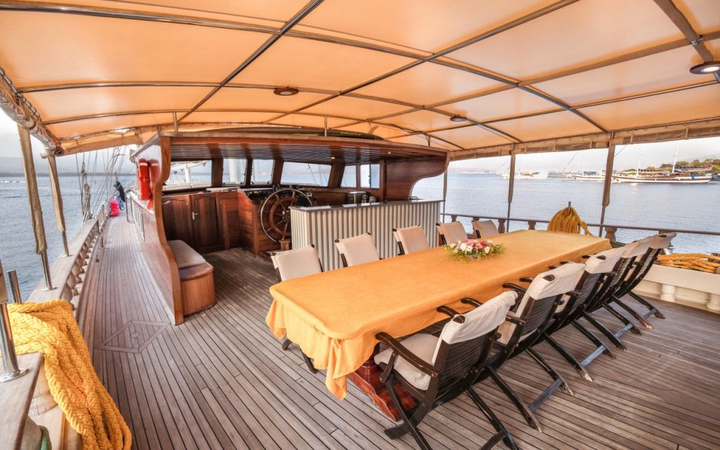 Machen Sie es sich auf den bequemen Liegestühlen bequem, genießen Sie den atemberaubenden Panoramablick auf versteckte Buchten und charmante Dörfer und lassen Sie sich von der sanften Meeresbrise zum Lachen bringen. Versammeln Sie sich im Essbereich im Freien und genießen Sie die köstlichen Mahlzeiten, die der Küchenchef an Bord zubereitet hat, tauschen Sie Geschichten aus und genießen Sie den Geschmack frischer Meeresfrüchte und lokaler Köstlichkeiten.